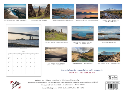 From renowned Scottish photographer Colin Baxter, our range of calendars are fantastic additions to any home or office. This is a 24 page engagement style wall calendar, opening to double size with a full page image on the top and a date box grid below for note taking. The calendar's dimensions are 22.8cm x 30.5cm (45.6cm x 30.5cm when opened). Our 2026 range come in plastic-free packaging. Colin's selection of stunning images of the Isle of Skye are: the Cuillin Hills from the south; Quiraing, Trotternish; Bla Bheinn across Loch Slapin; Duirinish beyond Loch Bracadale; Cuillin Hills beyond the River Sligachan; PS Waverley and the Skye Bridge; the Old Man of Storr, Trotternish; Glenbrittle and Loch Brittle from the Cuillin; Armadale Bay, Sleat; the Cuillin beyond Loch Leathan and Loch Fada; the Fairy Pools, Trotternish; the Cuillin and Loch Scavaig. |